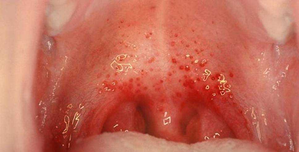 Высыпания в горле похожи на сыпь при герпесной ангине, но несколько крупнее (4-5 мм). Изначально они появляются на губах и полости рта, а затем распространяется на миндалины перед входом в горло, на язычок и небные дужки. Задняя стенка глотки поражается крайне редко.
