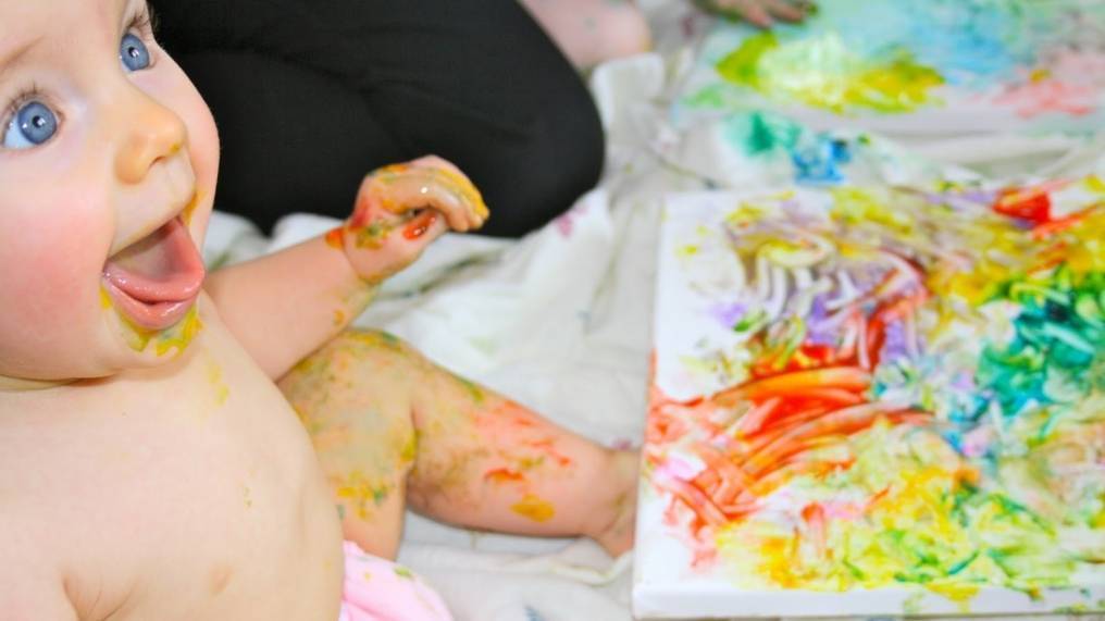 В 9 месяцев с детьми можно заниматься творчеством. Они с удовольствием наблюдают, как краски пропитывают бумагу, как на ней появляются линии фигуры. Пальчиковые краски – лучший выбор, они безвредны. Можно раскрасить каждый палец разным цветом и ставить отпечатки на бумаге.