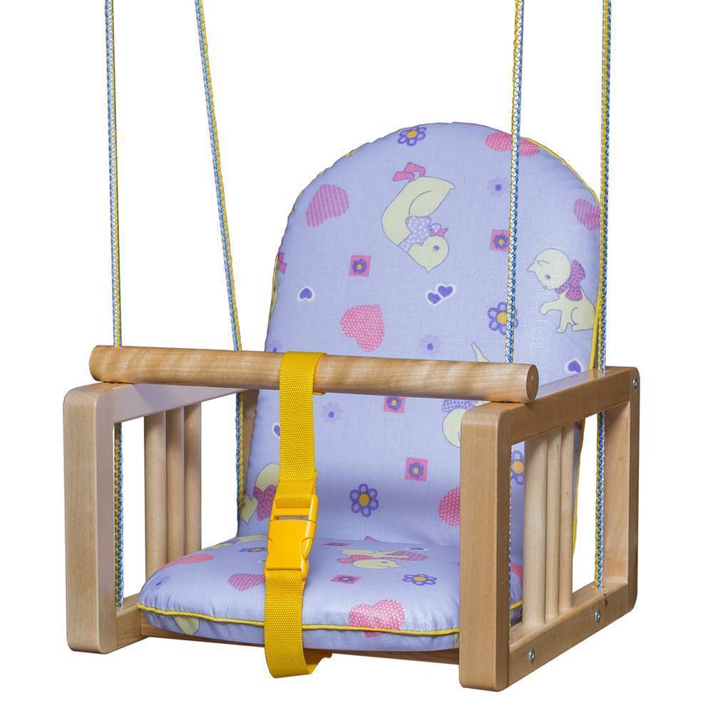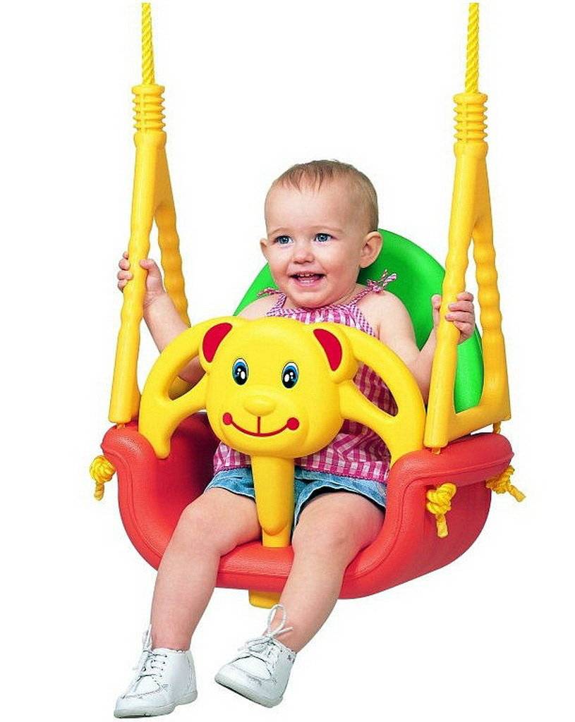 - Для детей от 1 года до 3 лет качели, как правило, более громоздкие. Они могут выдержать ребенка весом до 25 кг. Сидение и его спинка сделаны из твердого материала, они могут быть смягчены поролоном и тканевым чехлом. Есть модели, в которых предусмотрена возможность отрегулировать угол наклона спинки. При выборе таких качелей посмотрите, есть ли на них ремни безопасности, перемычка из ткани между ножек крохи, поручни и подножки. Обязательно проверьте надежность конструкции и наличие фиксаторов от непроизвольного складывания.