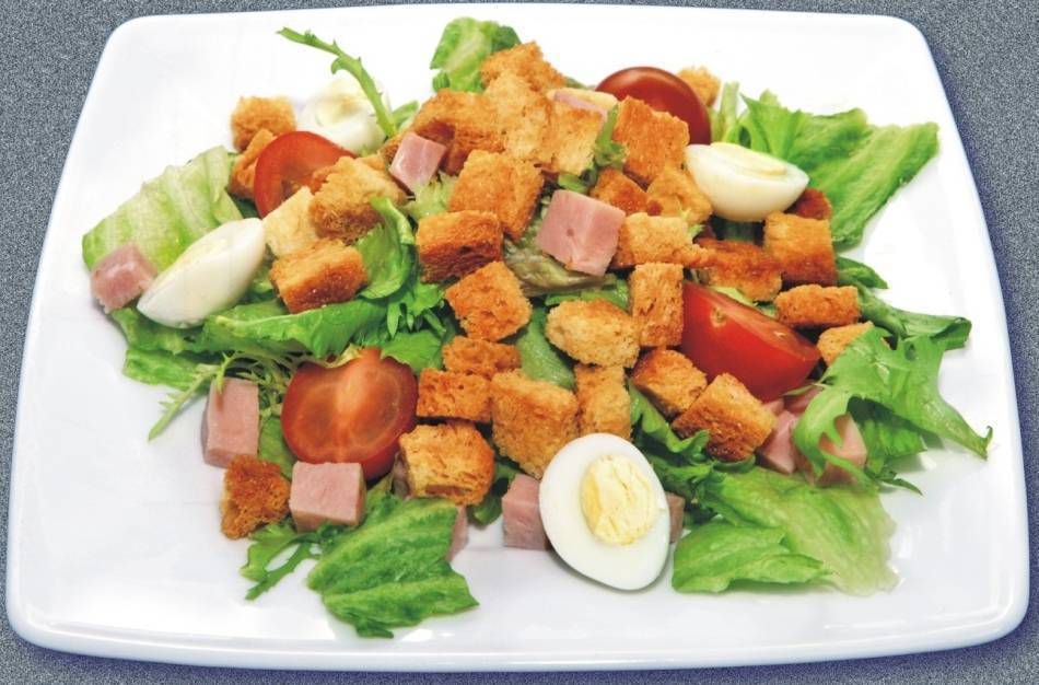 - Сначала отварите яйца. Листья салата промойте, подсушите и красиво уложите на тарелку.