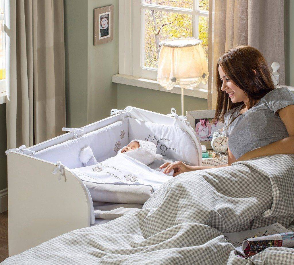 - купить кроватку со съёмным бортом (такая модель ставится вплотную к родительской кровати. Так малыш спит на своей территории, но ощущает присутствие мамы рядом. Со временем можно постепенно отодвигать детскую кроватку от взрослой).