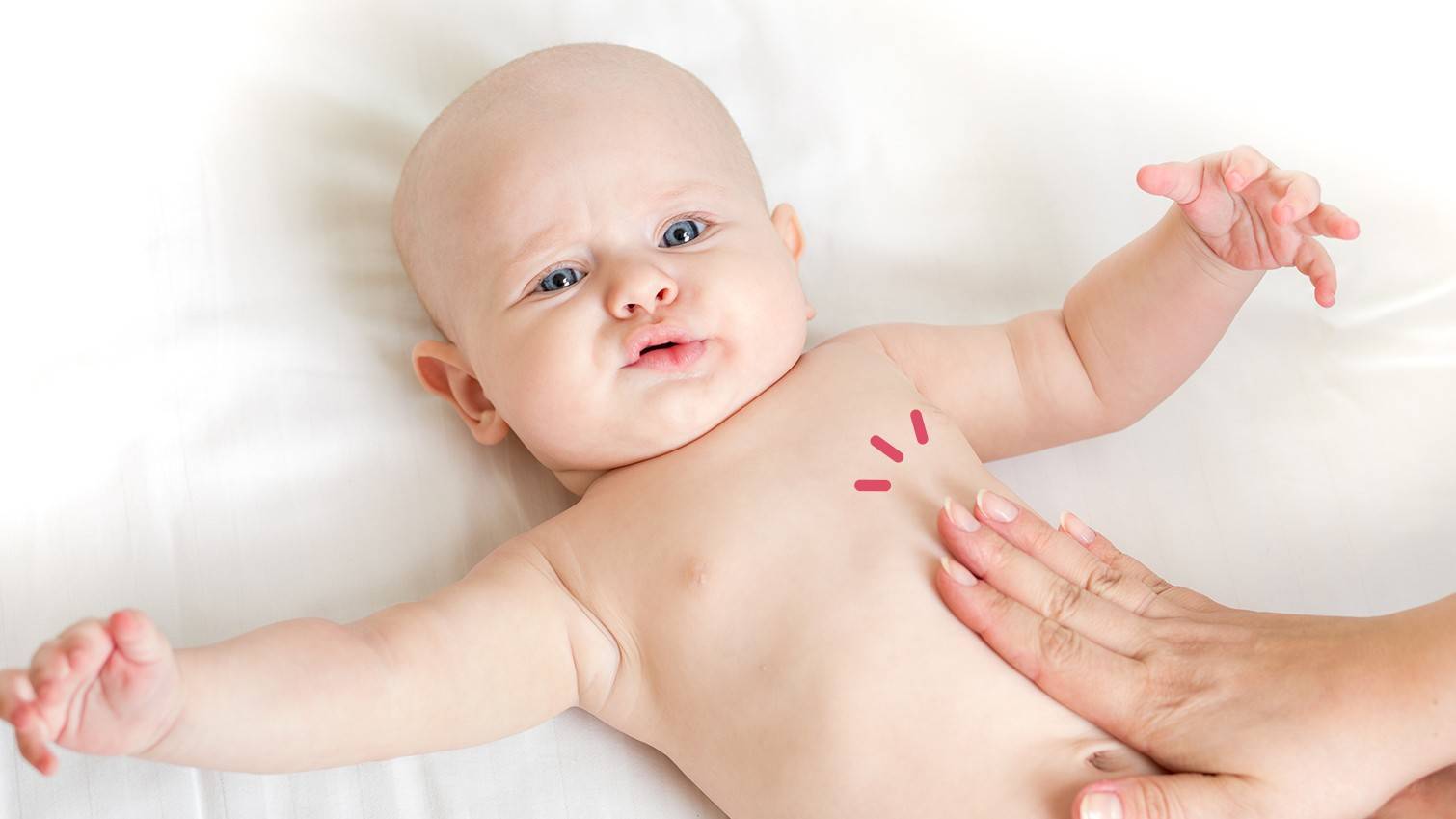 - Массаж: смажьте куру детским маслом, и по часовой стрелке легко массируйте животик ребенка. Круговые движения помогут кишечнику избавиться от нежелательных газов, вызывающих вздутие и боль.