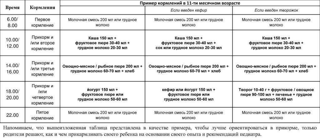 В возрасте 11 месяцев рекомендовано пятиразовое кормление малыша. Но допускается, что ребенок может есть как реже, так и чаще, ведь все дети разные. Все зависит от индивидуальных особенностей малыша. Примерный дневной рацион выглядит так: