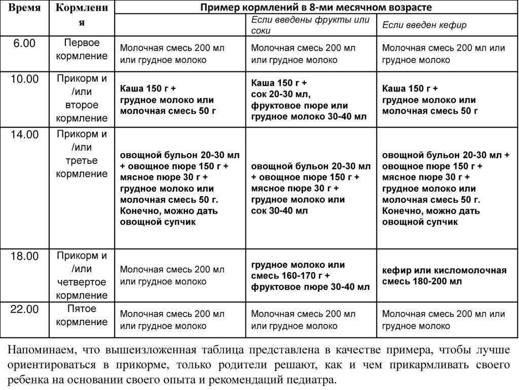Важно! Цель заключается в том, что ребёнок постоянно «встречается» с продуктом, но не наедается им. 8-месячному малышу даем прикорм 2–3 раза в день с постепенным увеличением к 9 месяцам до 3–4 раз с 1–2 дополнительными перекусами по желанию ребёнка