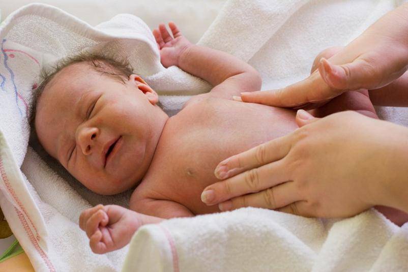 - Делать массаж животика. Гладить животик новорожденного по часовой стрелке и сверху вниз теплыми руками. Массаж выполнять по несколько раз в день после приема пищи (должно пройти не менее 40 минут). Длительность массажа – 10-15 минут.