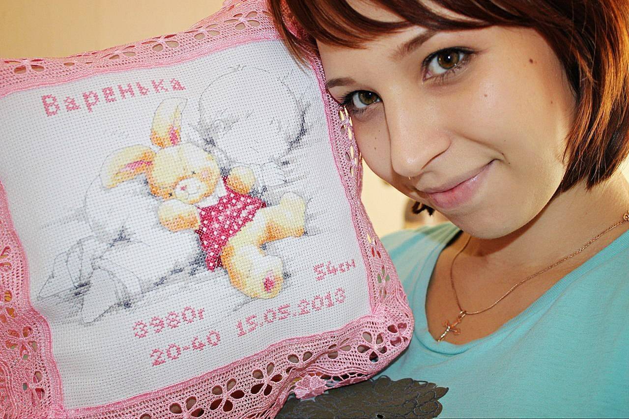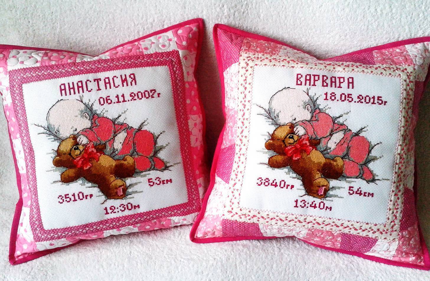 Интересная идея использовать вышивку для детской подушечки. Такая полезная и необычная вещь будет вполне актуальна в кроватке новорождённого.