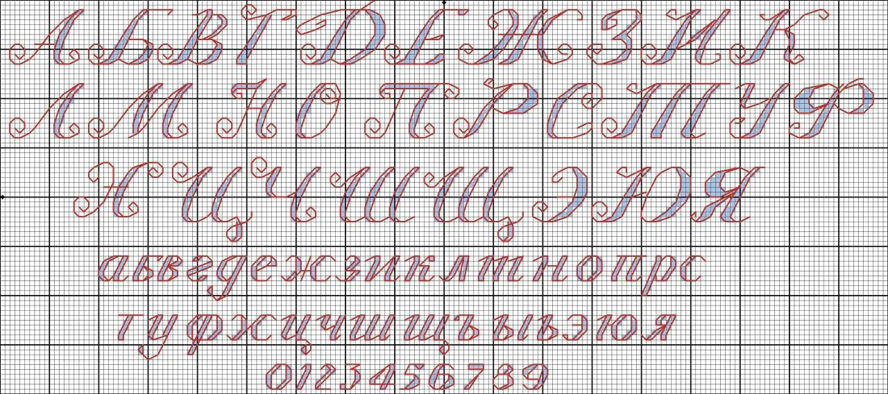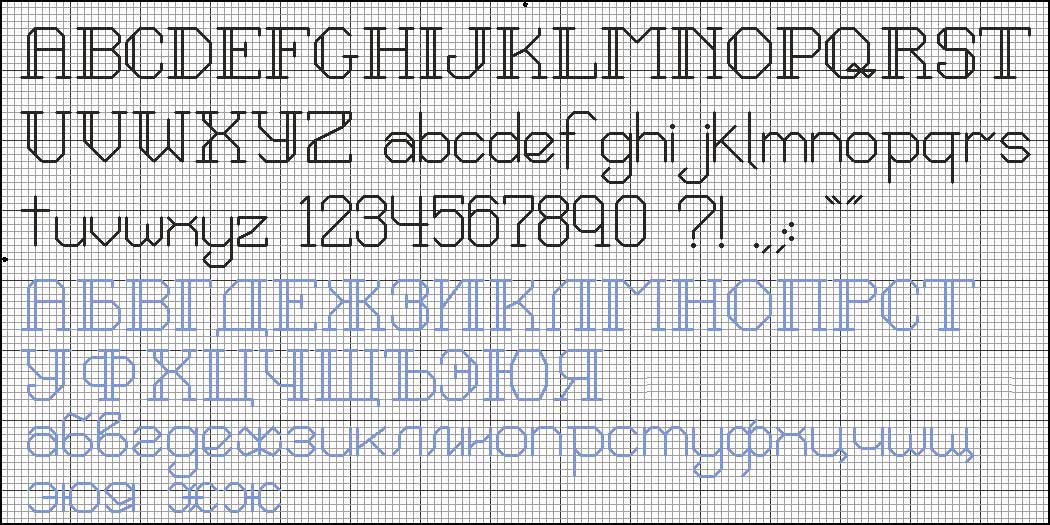 Например, я выбрала шрифт, которым буду вышивать имя. Я считаю по схеме, сколько клеток в длину занимает каждая буква, записываю, складываю эти цифры, при этом помню о том, что часто между буквами так же оставляют расстояние в одну клеточку, поэтому прибавляю к той сумме по одной клетке после каждой буквы и получаю длину имени в клетках. И могу отметить на канве двумя точками, где у меня будет начинаться и заканчиваться имя. Соответственно, я сразу вижу, можно и нужно ли подвинуть надпись вправо-влево-вверх-вниз, нужно ли взять шрифт побольше или поменьше.
