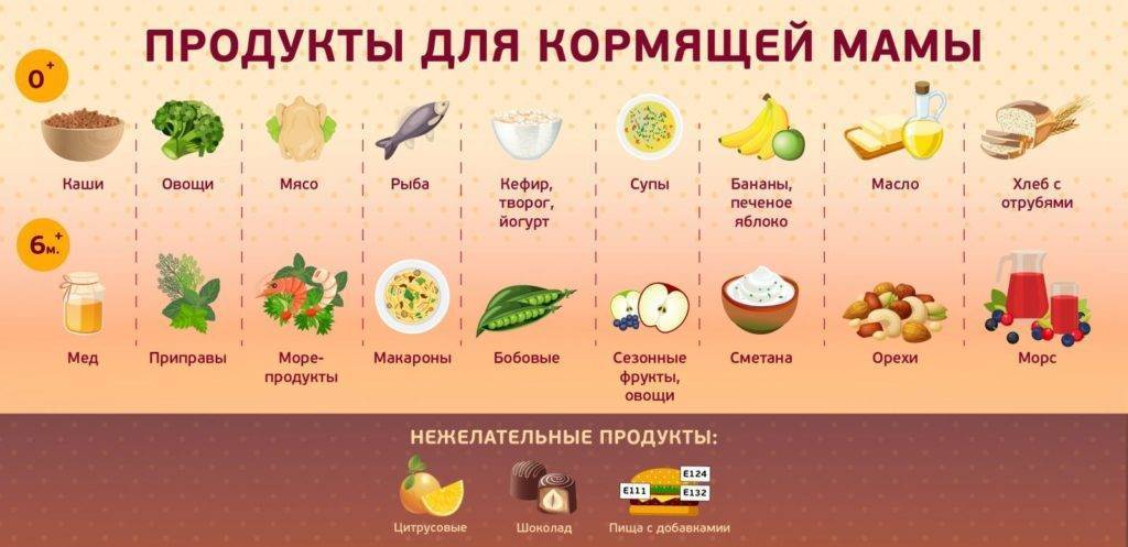 Качество, количество молока определяются рационом матери. Калораж суточного меню превышает стандартный на 400 калорий. Продукты, разрешенные при грудном вскармливании — белковая пища, фрукты и овощи, молочная продукция, рыба. Если у близких родственников есть аллергия на какой-то продукт, его исключают из рациона.