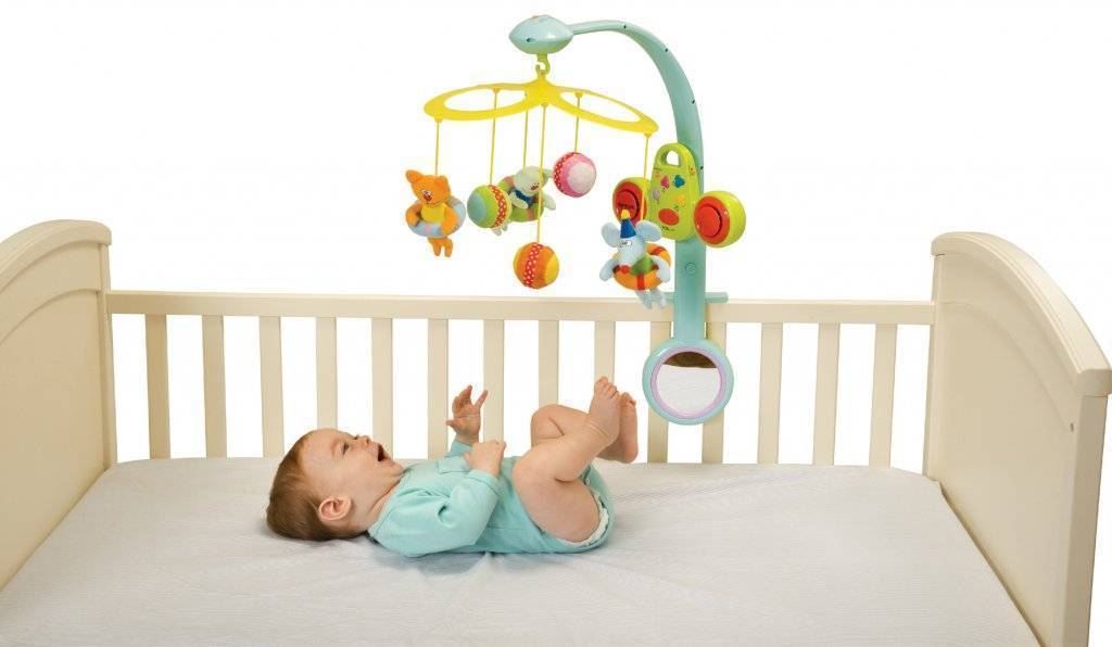 Популярную игрушку – мобиль вешать следует не прямо над головой грудничка, а чуть в стороне. Первые три месяца любые предметы на расстоянии 40 см над лицом малыш не рассмотрит все равно