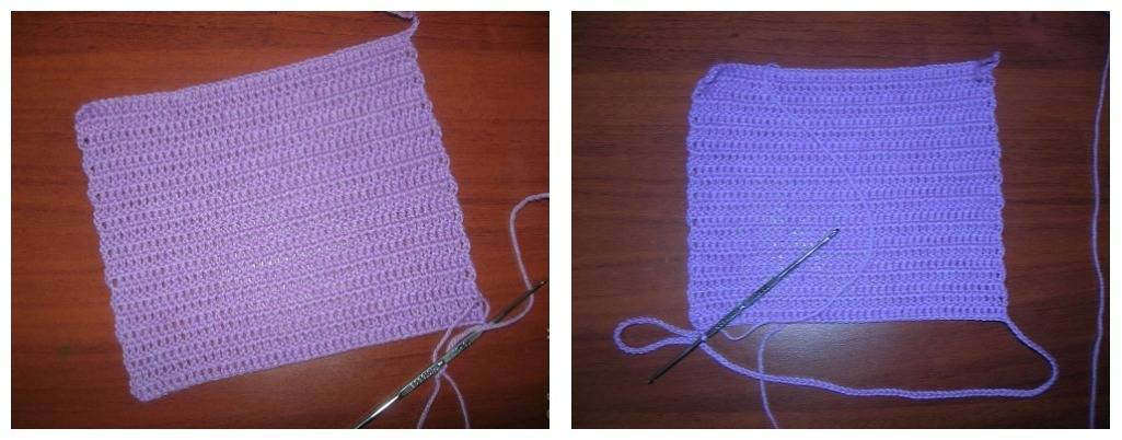 Комбинезон вяжется столбиком с накидом, а начинается вязание со спинки. Набрать 44 воздушные петли, и поднять 21 ряд. Не отрываясь от работы, набрать 91 воздушную петлю и замкнуть косичку на противоположной стороне, связанной спинки от начала набора.