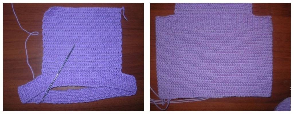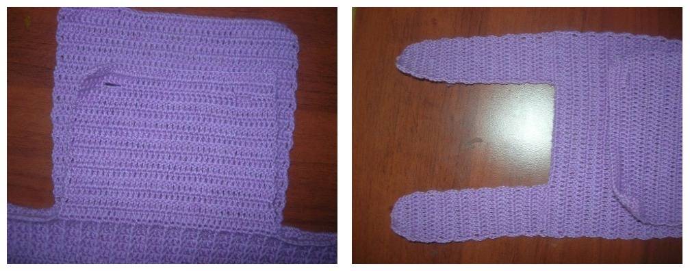 Теперь на серединке переда выбрать 39 петель и вязать их столбиком с накидом 13 рядов. В 14 ряду сделать прорези для пуговиц. Поверх провязать еще два ряда столбиками с накидом. На спинке сделать лямки по 12 столбиков с накидом, поднять на 14 рядов.