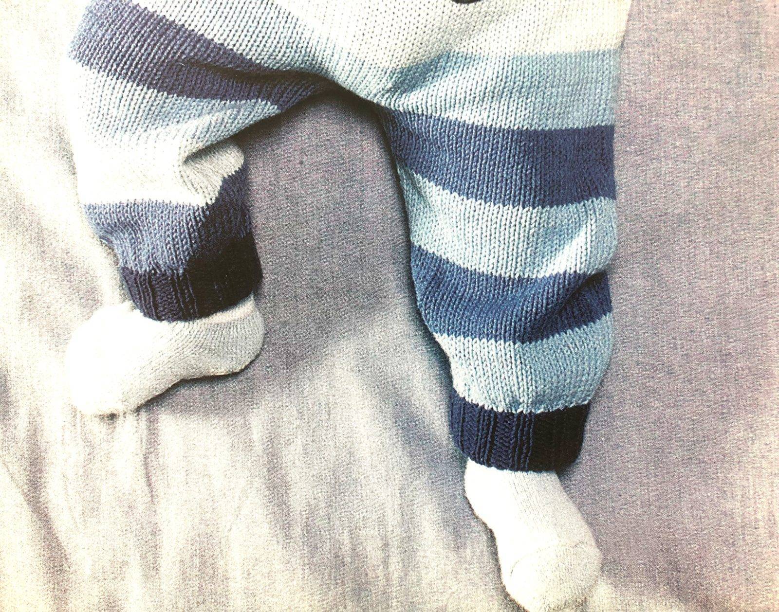 - Сначала вяжется верхняя часть, представляющая из себя кофту с рукавами, потом мастерица постепенно переходит к штанишкам. Штанишки могут быть закрытыми по типу колготок или ползунков или открытыми. В первом случае самая нижняя часть выполняется классической чулочной вязкой. Вариант с закрытыми ножками удобен для самых маленьких, с открытыми — для детей постарше, которые уже умеют активно двигаться;