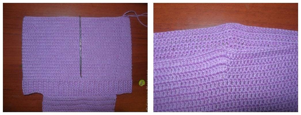 Определите середину, ориентируясь на связанную спинку, и вывяжите ластовицу. Для этого делаем следующее: