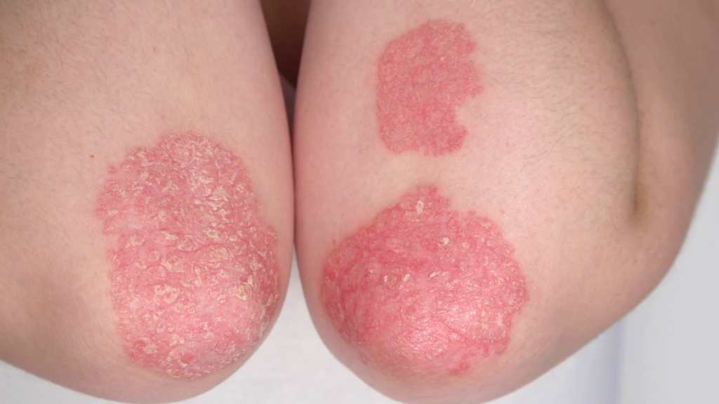 Псориаз проявляется в виде красных пятен, сопровождающихся сильным зудом и отшелушиванием клеток дермы.