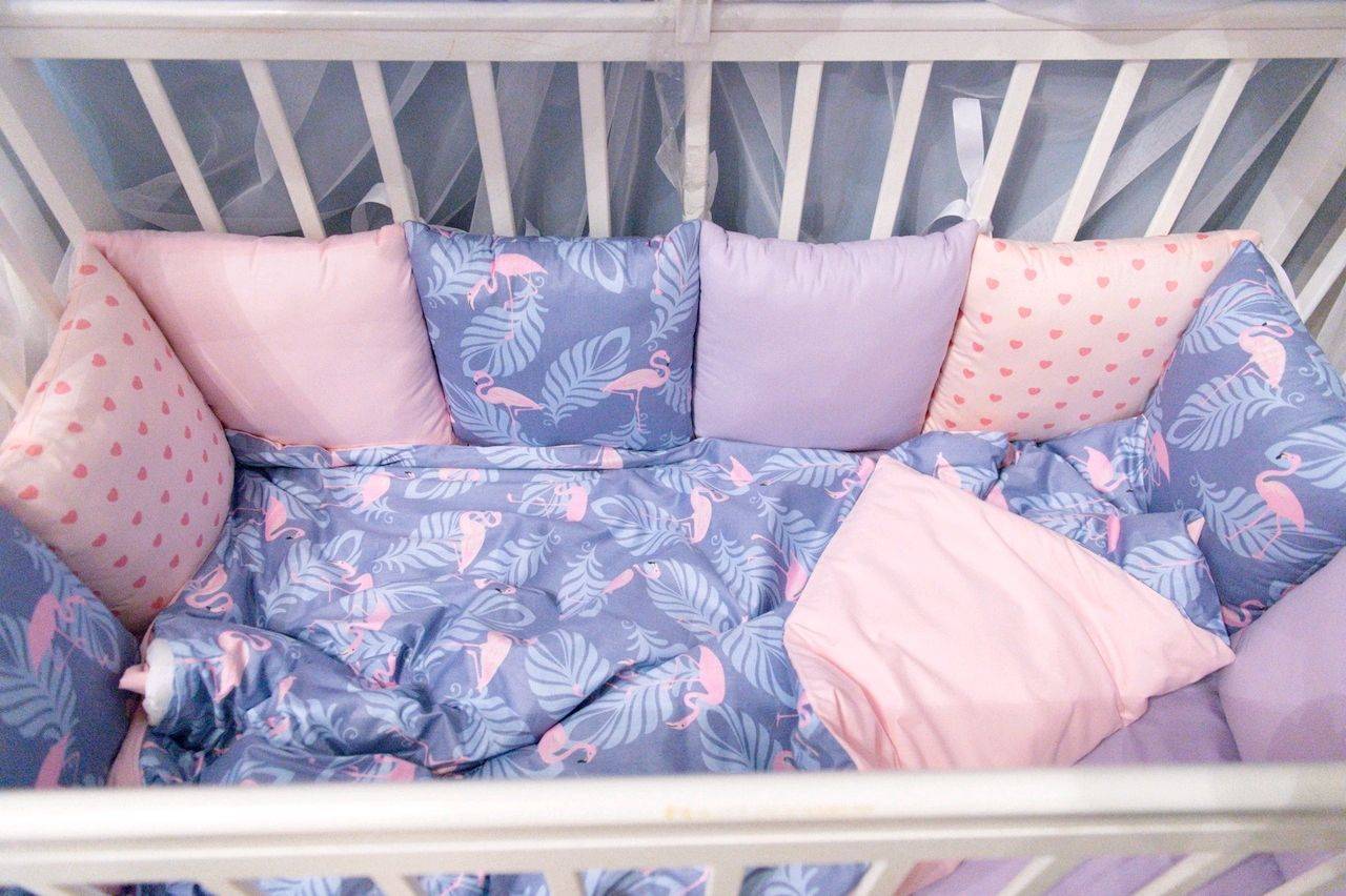 Делают бортики из натуральной хлопковой ткани или другого мягкого и натурального материала, подходящего ребенку, например, из байки. В качестве наполнителя используется синтепон или холлофайбер, а вот использовать поролон не рекомендуется, так как он плохо сохнет и может стать рассадником грибка.