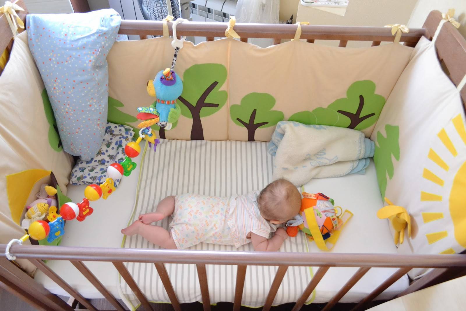 С рождения младенцы не отличаются большой подвижностью. Однако со временем становятся заметны изменения. Грудной ребенок начинает реагировать на игрушки, двигаться и самостоятельно переворачиваться в кроватке. Для предотвращения травм от ударов и падений на обрешетку кровати привязывают мягкую обшивку.