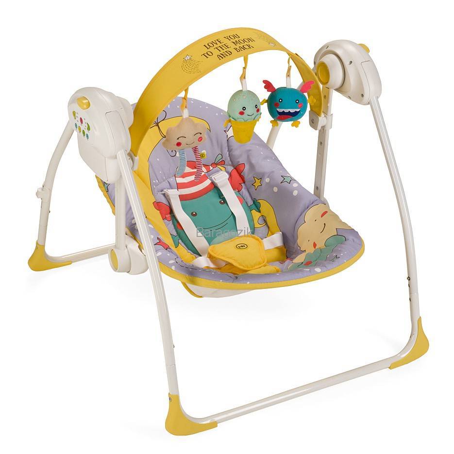 Выбирая новые стильные качели для младенцев, присмотритесь к такому популярному варианту, как Jetem Palladio. Эта конструкция является очень мобильной, она отлично подходит для родителей, не сидящих на месте. Примечательно, что обивка электрокачелей с легкостью снимается для чистки – стирать ее можно даже в холодной воде. 5-точечные ремни обязательно присутствуют:
