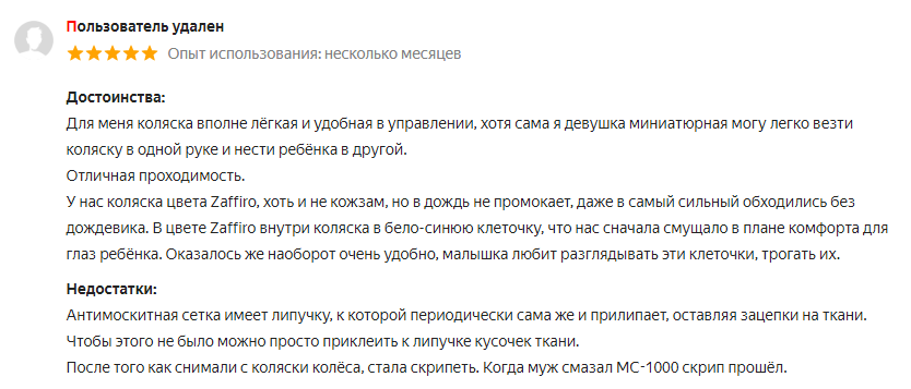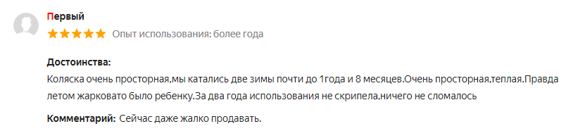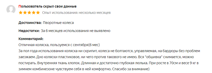 Пользователи подтверждают, что спустя полгода активной эксплуатации коляска по-прежнему выглядит как новая, ничего не скрипит. Очень удобно, что снимается вся обшивка, — это значительно облегчает уход.