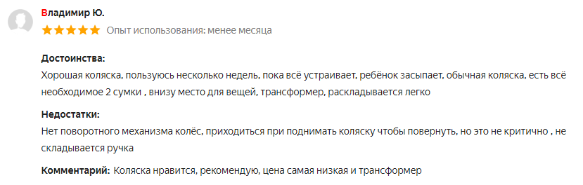 Пользователи отмечают, что коляска функциональная и вместительная. Ручка не складывается, а колеса не оборудованы поворотным механизмом, что менее удобно.