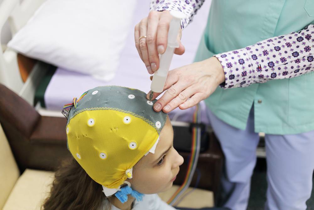 Электроэнцефалографию проводят в свето- и звуконепроницаемой комнате небольшого размера. В ней находится кушетка или пеленальный столик и аппаратура для диагностики. Процедура выполняется при помощи регистрирующего устройства, называемого энцефалограф. Для того чтобы записать энцефалограмму, на голову ребенка надевается специальная шапочка. Она может иметь вид тканевого шлема со вшитыми электродами либо резиновой сетки с участками для фиксации необходимого количества датчиков.